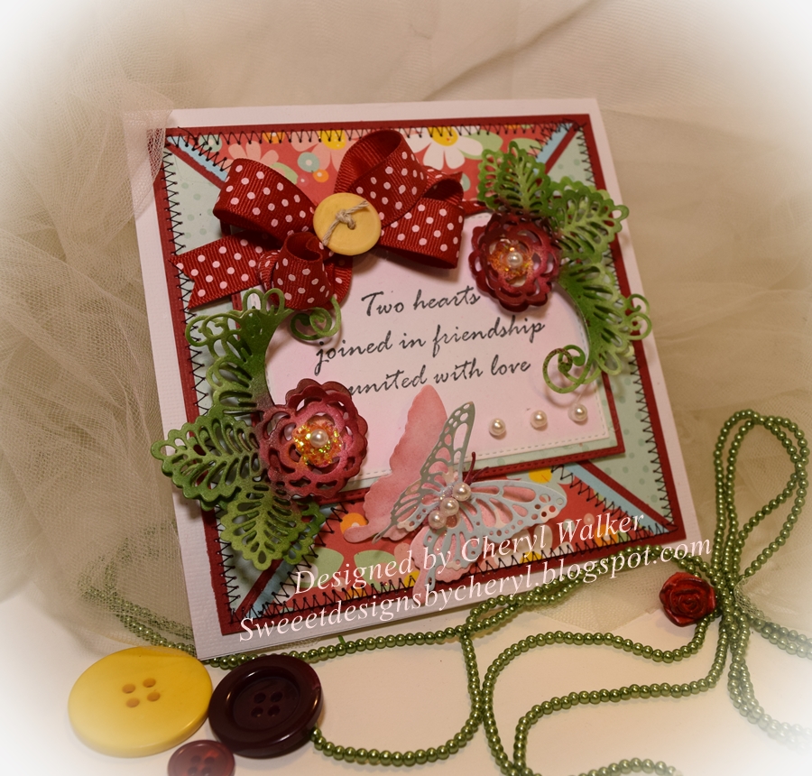 Butterfly Lisbeth was cut in a pink card stock, and a blue pattern paper, layered and I did add some pearls to it as well.