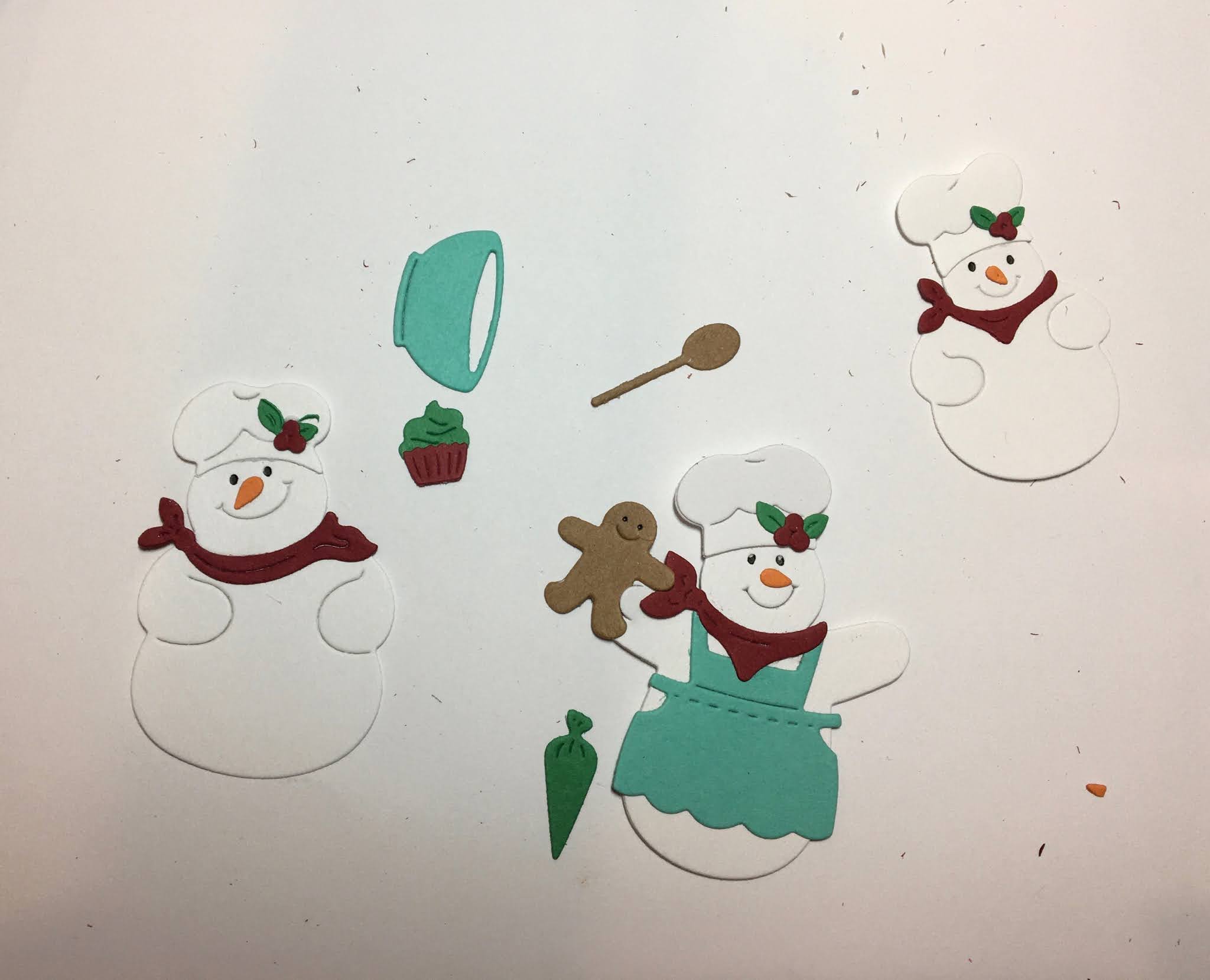 1. Using Baking Spirits Bright cut kraft and white card stock. Glue the white on top of the baking and bright. I used a little brown ink on the rolling pin2. Also cut out all of the little snowmen using white, green, blue, tan, orange and red card stock