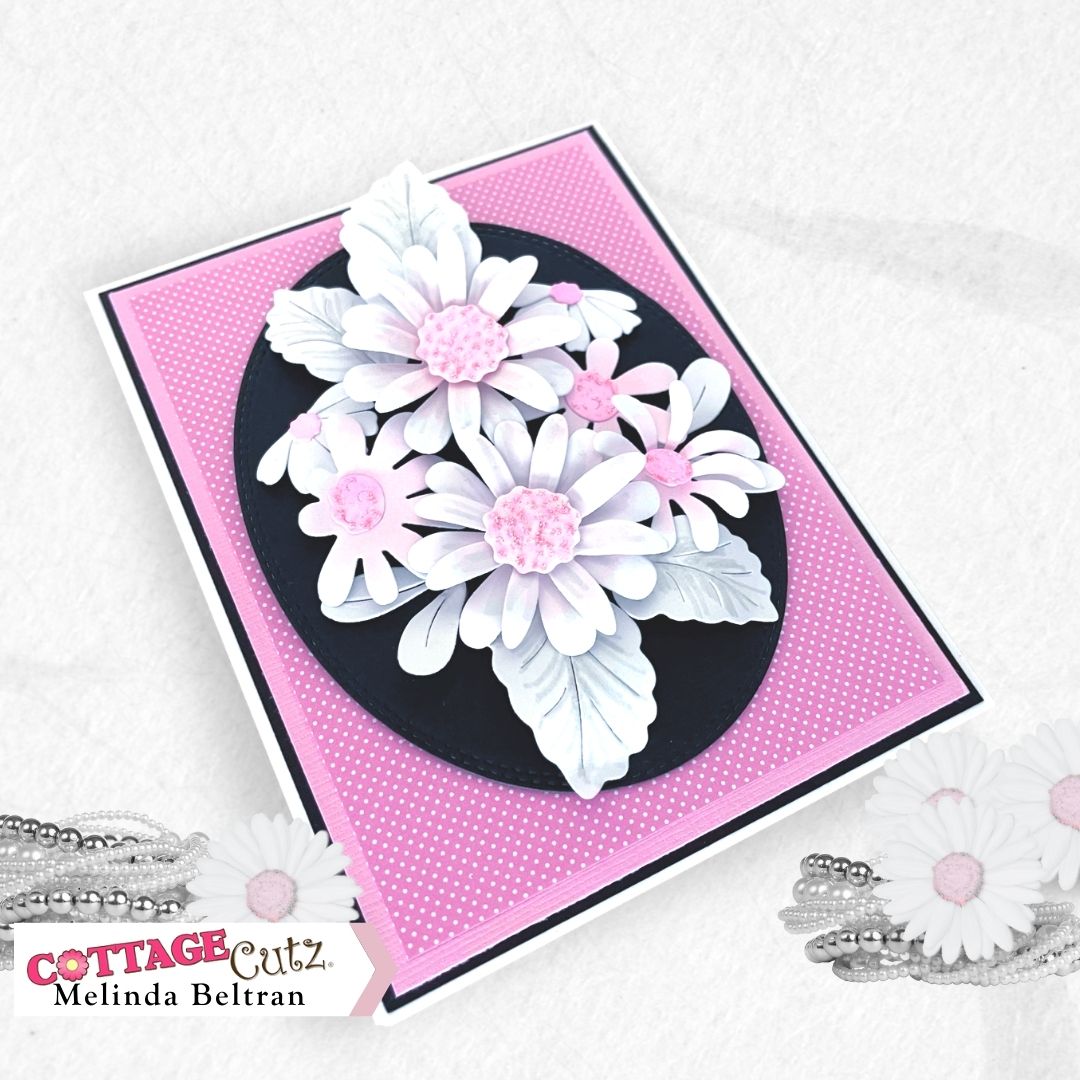 Here is a view with the card at an angle so you can see more of the dimension of the flowers and leaves. I added some stickles to the centers of the flowers for a little extra touch. I then mounted the black oval with all the flowers onto three layers of mats. A Black, Pink and Pink and White Polka dot layer. All of that went onto a top folding standard A4 white cardstock base.