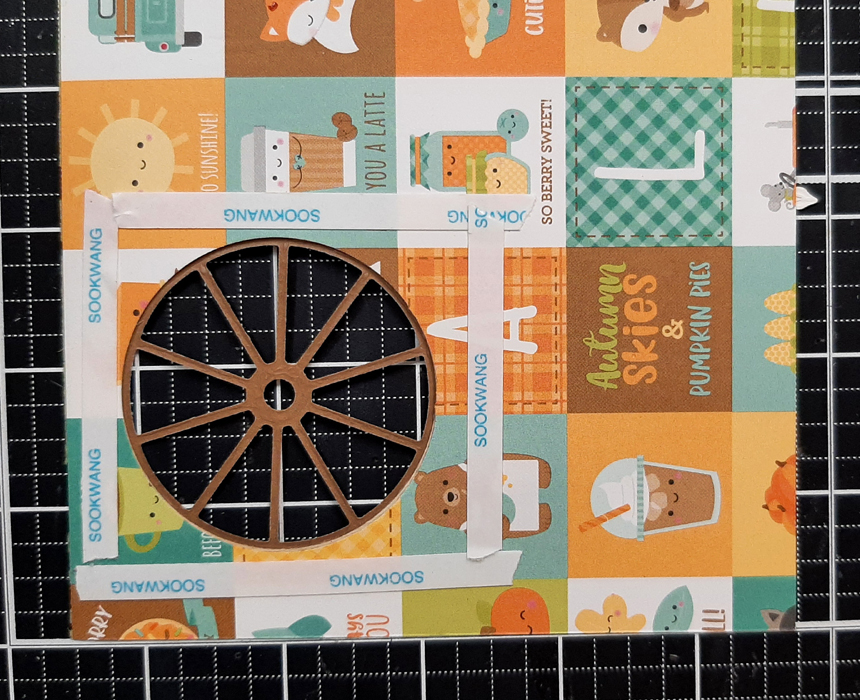 • I glued the larger outer wheel on top of die cut opening, then the smaller wheel on top.