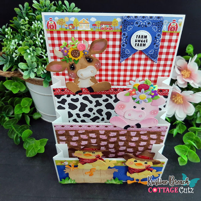I just LOVE how this turned out!! Like I said, I would make those 2 changes (1/4" smaller w & h) and I would attach my papers over the flaps when adhering my tiered panels. But overall, these COTTAGECUTZ dies make the cutest cards for this farm-lovin' girl!!